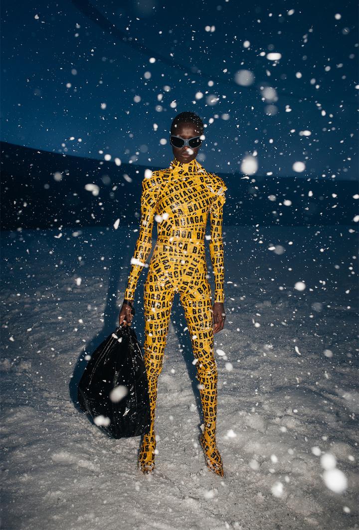01. 巴黎世家的貴垃圾袋今年 3 月,巴黎世家在人造暴風(fēng)雪里安排了一場(chǎng)走秀。這場(chǎng)模糊了視線的茫茫大雪中,依稀看到許多模特單手提了一個(gè)大黑袋子。