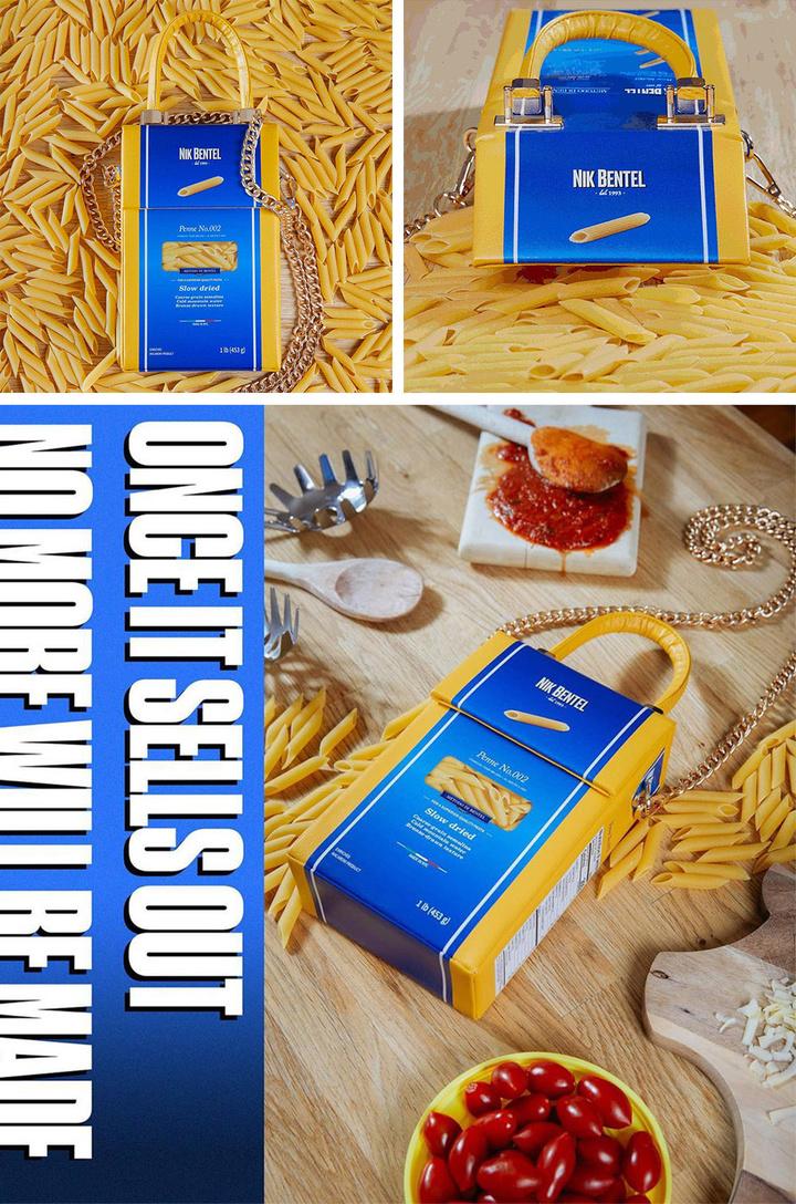正好在一年前,Nik 還做過另一個(gè)紙箱包包,不過是用經(jīng)典的 Barilla 品牌的意大利通心粉包裝盒來(lái)設(shè)計(jì)的迷你包包——Pasta Bag。