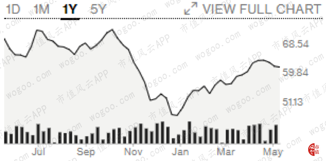 (WTI原油期貨1年內(nèi)價(jià)格走勢(shì)圖 $/bbl,Bloomberg)