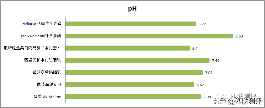 pH數(shù)據(jù)上,綠茶多酚這款的數(shù)值偏大,其它6款算是屬于防曬里適宜的范圍。