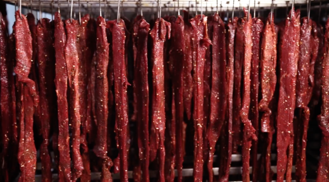 按照傳統(tǒng)風(fēng)干牛肉的做法,牛經(jīng)過統(tǒng)一屠宰之后,牛肉進(jìn)入冷庫(kù)。需要生產(chǎn)時(shí),將牛肉取出,再進(jìn)行人工分割,“我們用的都是牛后腿肉”,所以還需要人工去筋膜,再切成條狀,交給腌制師傅進(jìn)行腌制,腌制之后進(jìn)風(fēng)干房,到7成或9成干度,再進(jìn)行切塊、切條、切短,預(yù)包裝之后消毒殺菌,后完成全包裝。整個(gè)過程耗時(shí)耗力,光風(fēng)干的時(shí)間有時(shí)候就需要接近2天。