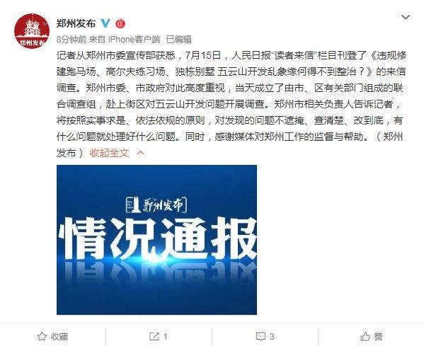 記者從鄭州市委宣傳部獲悉,7月15日,人民日?qǐng)?bào)“讀者來(lái)信”欄目刊登了《違規(guī)修建跑馬場(chǎng)、高爾夫練習(xí)場(chǎng)、獨(dú)棟別墅 五云山開發(fā)亂象緣何得不到整治?》的來(lái)信調(diào)查。鄭州市委、市政府對(duì)此高度重視,當(dāng)天成立了由市、區(qū)有關(guān)部門組成的聯(lián)合調(diào)查組,赴上街區(qū)對(duì)五云山開發(fā)問(wèn)題開展調(diào)查。鄭州市相關(guān)負(fù)責(zé)人告訴記者,將按照實(shí)事求是、依法依規(guī)的原則,對(duì)發(fā)現(xiàn)的問(wèn)題不遮掩、查清楚、改到底,有什么問(wèn)題就處理好什么問(wèn)題。同時(shí),感謝媒體對(duì)鄭州工作的監(jiān)督與幫助。