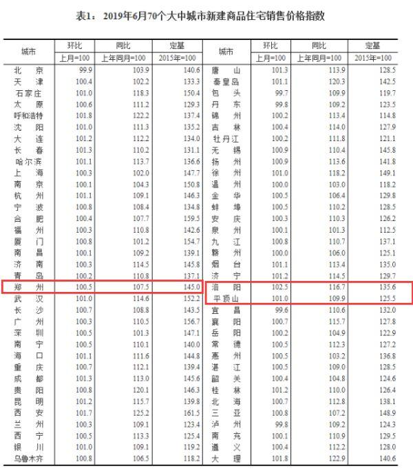 6月份70城房?jī)r(jià)出爐!7月15日,統(tǒng)計(jì)局發(fā)布了2019年6月份70個(gè)大中城市商品住宅銷售價(jià)格變動(dòng)情況統(tǒng)計(jì)數(shù)據(jù)。整體來(lái)看,6月有63城新建商品住宅價(jià)格環(huán)比上漲,較5月減少4城。其中,新房?jī)r(jià)格環(huán)比漲幅居首的城市是洛陽(yáng),漲2.5%領(lǐng)跑;鄭州環(huán)比漲0.5%,北上廣深分別跌0.1%、漲0.3%、漲0.3%、漲0.5%。