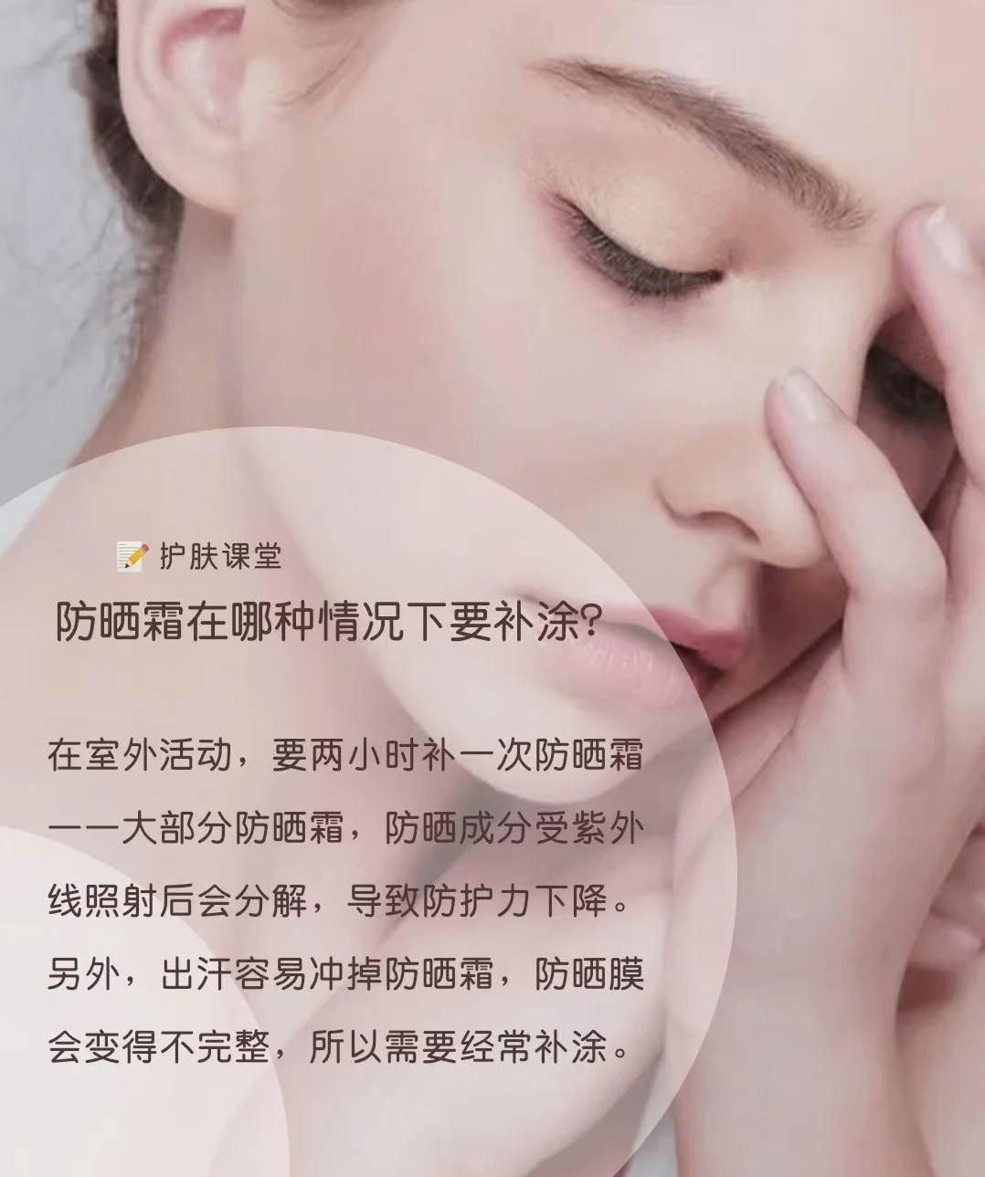 涂完后出門補(bǔ)涂防曬霜也是一個(gè)很重要的事情。特別愛(ài)護(hù)自己的皮膚的人,在戶外活動(dòng)時(shí),每?jī)蓚€(gè)小時(shí)補(bǔ)涂一次防曬霜為佳。