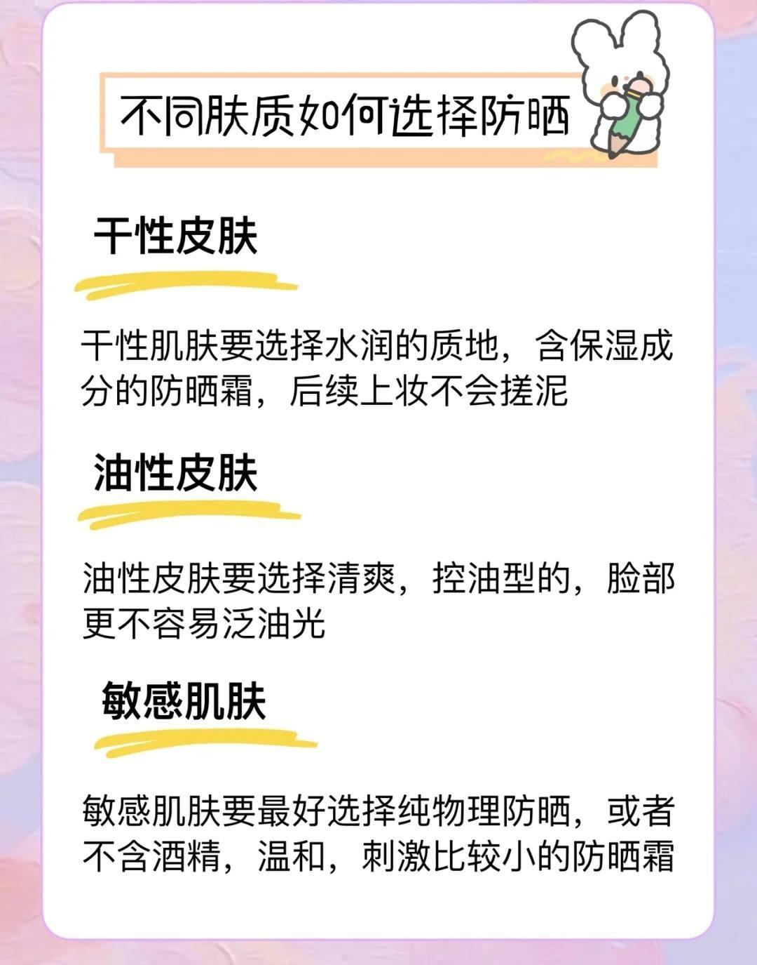所以如果要經(jīng)常涂抹防曬霜的女士,記得選準(zhǔn)適合自己的防曬霜:敏感肌選擇市面上主打溫和的,油皮選干爽清透型,干皮多用滋潤(rùn)養(yǎng)膚型。