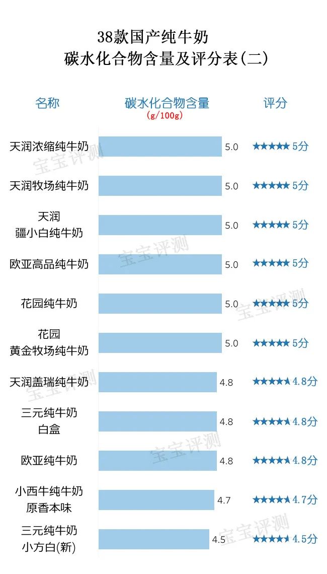 表(二)的11款純牛奶中,天潤、歐亞、花園等五款純牛奶的碳水化合物含量高,達(dá)5.0g/100g。三元純牛奶小方白(新)低,碳水化合物含量為4.5g/100g。