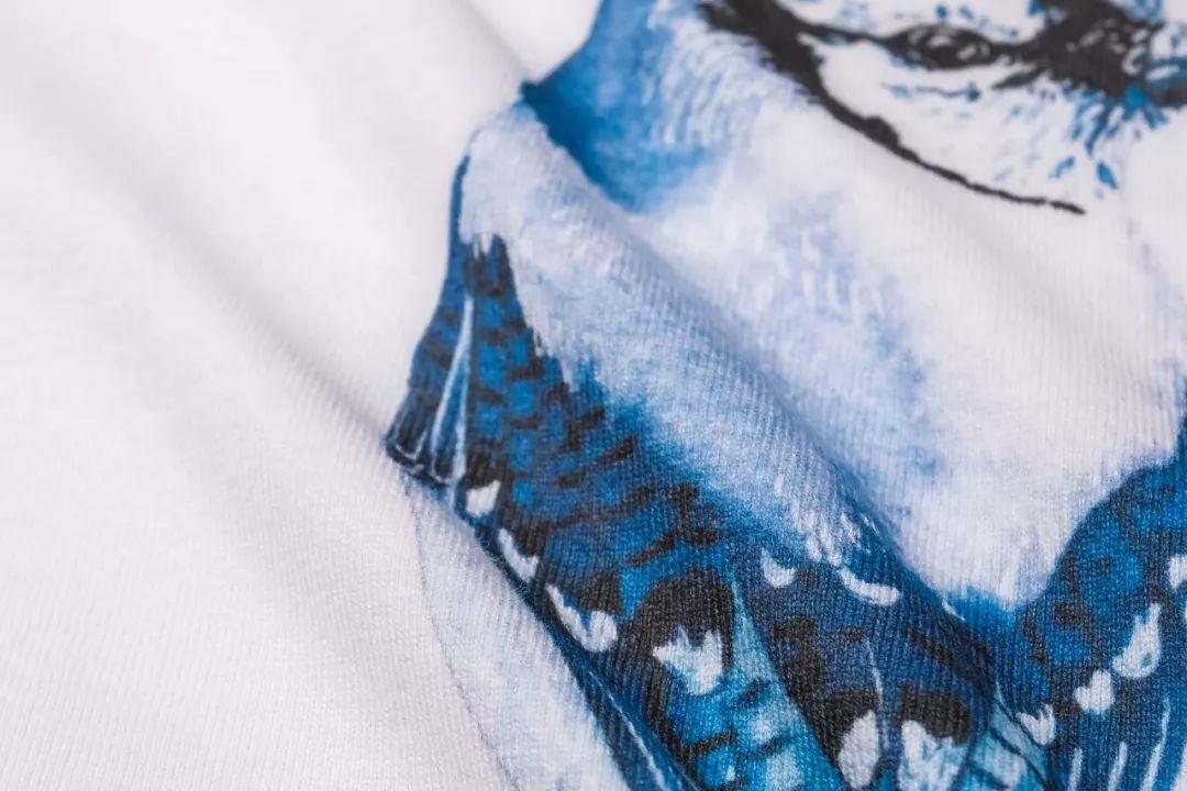 T恤采用涂料數(shù)碼印花,可以長(zhǎng)久保持顏色的鮮艷度,透氣性好。
