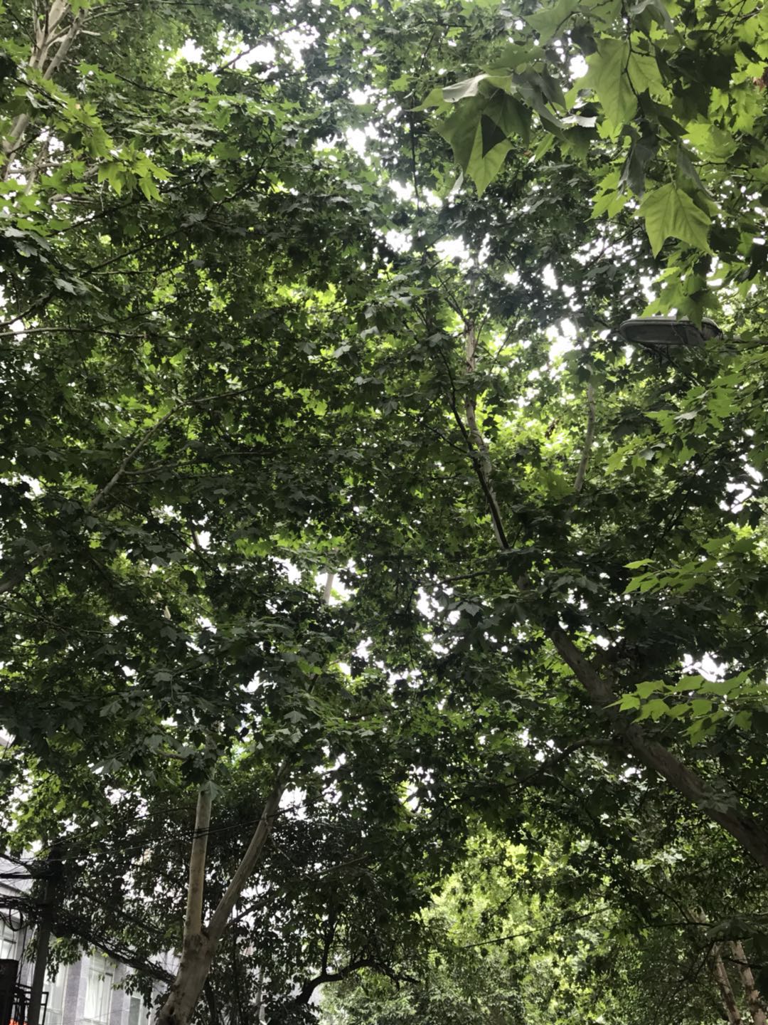 在轟轟烈烈的城市建設(shè)過程中,因?yàn)橐獢U(kuò)建街道,許多長了多年的行道樹被砍伐掉了。那東風(fēng)渠邊帶給你“碧玉妝成一樹高,萬條垂下綠絲絳”的垂柳,大概是由于過于婆娑和纏綿,顯得不齊整而被伐掉的吧;而那一旦開花就香飄整條街,“葉密千層綠,花開萬點(diǎn)黃”的桂花樹,卻因?yàn)閭€子太矮的緣故,終不能擔(dān)當(dāng)改朝換代的大任;而法梧樹可能是因?yàn)闅v經(jīng)滄桑,趕不上人們的審美變化速度,也或者是因?yàn)榇合膿Q季時,其果實(shí)會引起城市中的“球果飛絮”, 這種飛絮會引起呼吸道不適或過敏,對皮膚過敏者也不利,所以,也終難逃被替換的命運(yùn)。如今,這種樹只在一些比較偏僻或小的街道上還能看到她們的身影,但那總給人一種窮途末路之感,像眼前這樣遮天蔽日的法國梧已經(jīng)成為城市里珍稀的風(fēng)景。這種樹,給城市貼上了追憶、懷念的標(biāo)簽,讓人每每路過她身旁,總?cè)滩蛔【鞈?,忍不住欣喜。每?dāng)我走入喧囂的小城,總要走過這條街,總要來看看這些樹,就像來看我的老朋友,給她來一場夏日的愛戀,擁她入懷,讓她給我以情思,給我以靈感,給我浮躁的心注入一劑清涼的慰藉。而此時,我也總會想起一句話——“心里有你的人,無論多遠(yuǎn)都是順路?!卑?,我的法國梧!啊,我的解放街!啊,我的小城!