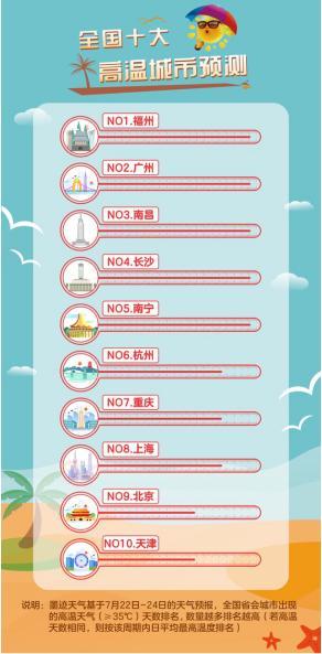 自大暑至24日的三天內(nèi),全國省會(huì)城市中出現(xiàn)高溫天氣的天數(shù)多的分別是,福州、廣州、南昌、長(zhǎng)沙、南寧,三天均將出現(xiàn)高溫天氣,杭州、重慶、上海將出現(xiàn)兩天高溫天氣,北京、天津則為一天。這十大高溫省會(huì)城市中,廣州、長(zhǎng)沙、重慶、上海均在“全國十大怕熱城市”之列。