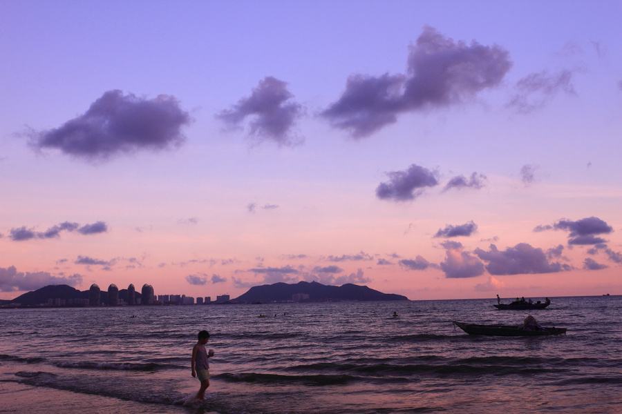 傍晚時分,我們回到 三亞 灣準(zhǔn)備看日落,這的 是 三亞 適宜觀賞日落的地方。二十里長的 濱海 大道椰樹成林,日落時分,紅霞滿天,樹影搖曳,海風(fēng)習(xí)習(xí),很美、很靜謐。這么美的夕陽也是要趕對時候才欣賞的到,有不少時間因為風(fēng)、雨、云的影響會看不到這雄渾日落。我們很幸運,沒有在旅游高峰期來這里,否則熙熙攘攘的游客會讓這份自然美景失色不少。