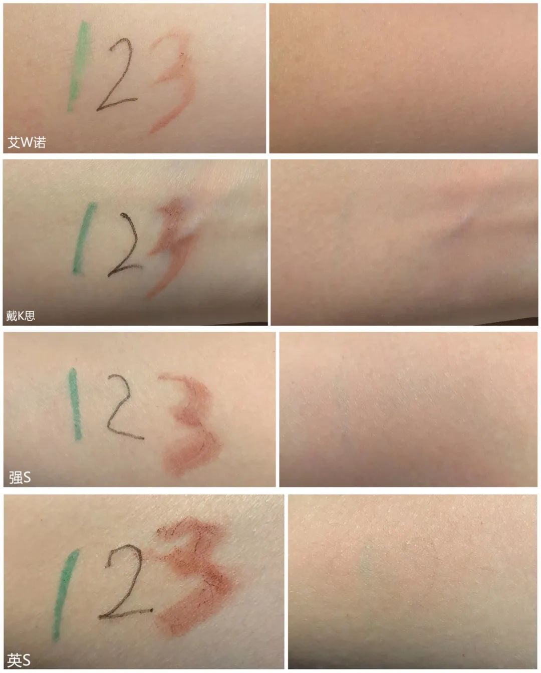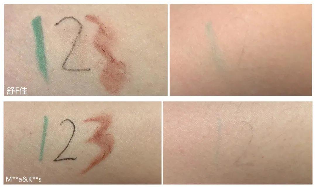 ②用綠/黑/棕三色的水彩筆/簽字筆/蠟筆,在手臂上分別寫1/2/3,靜置5分鐘,取各款樣品0.2g,揉搓20次,再用清水沖洗30秒,擦干后比較手臂上的筆跡。