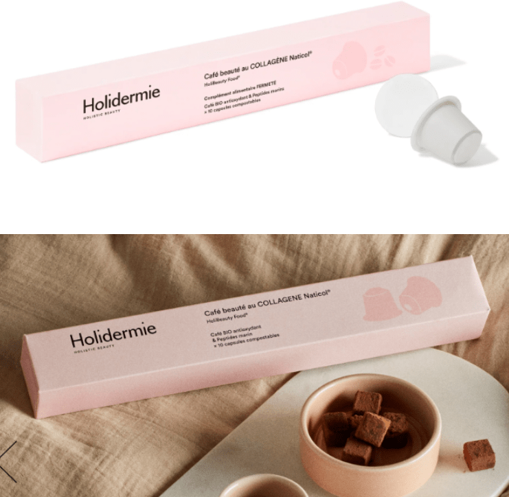 英國(guó)內(nèi)外兼修的小眾護(hù)膚品牌Holidermie推出美容咖啡,宣稱使用獨(dú)特的咖啡配方。 產(chǎn)品添加富含來(lái)自水產(chǎn)養(yǎng)殖魚皮的 Naticol? 海洋膠原蛋白,具有減少皺紋、緊致肌膚和抗氧化的作用,復(fù)配可可豆,也有咖啡提神的功。 包裝上,咖啡膠囊由可堆肥材質(zhì)制成,體現(xiàn)品牌的環(huán)保理念。