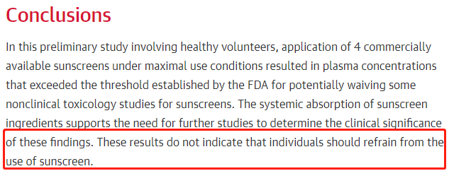 這個結(jié)論直白轉(zhuǎn)譯過來的意思就是:極端地使用有這幾種化學(xué)成分的防曬霜,人體吸收后會超過一個值,但超過這個值之后,會不會對人體造成什么危害呢?有可能,但這個需要更進(jìn)一步的臨床研究?,F(xiàn)在的研究結(jié)果并沒有得出“大家不要使用防曬霜”這么一個結(jié)論。