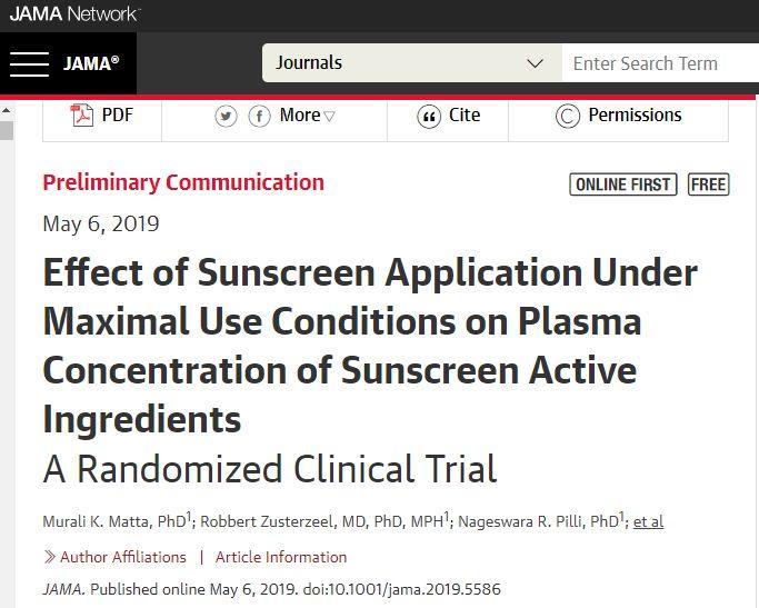 要計(jì)劃進(jìn)行的一系列研究中, 現(xiàn)在,F(xiàn)DA研究人員的一項(xiàng)初步研究表明,這些防曬成分實(shí)際上可能通過皮膚吸收的水平高于之前認(rèn)知的水平。這項(xiàng)研究工作于今年5月6日發(fā)表在《美國醫(yī)學(xué)會雜志》(Journal of the American Medical Association)上。