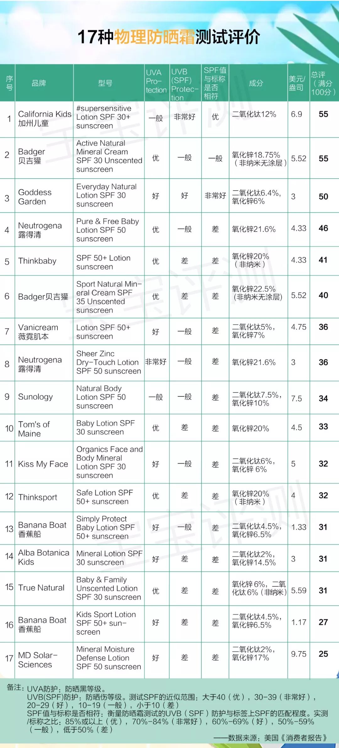 截止到今年4月,美國《消費(fèi)者報(bào)告》一共測試了17種物理防曬產(chǎn)品,我們來看看它們的表現(xiàn)。