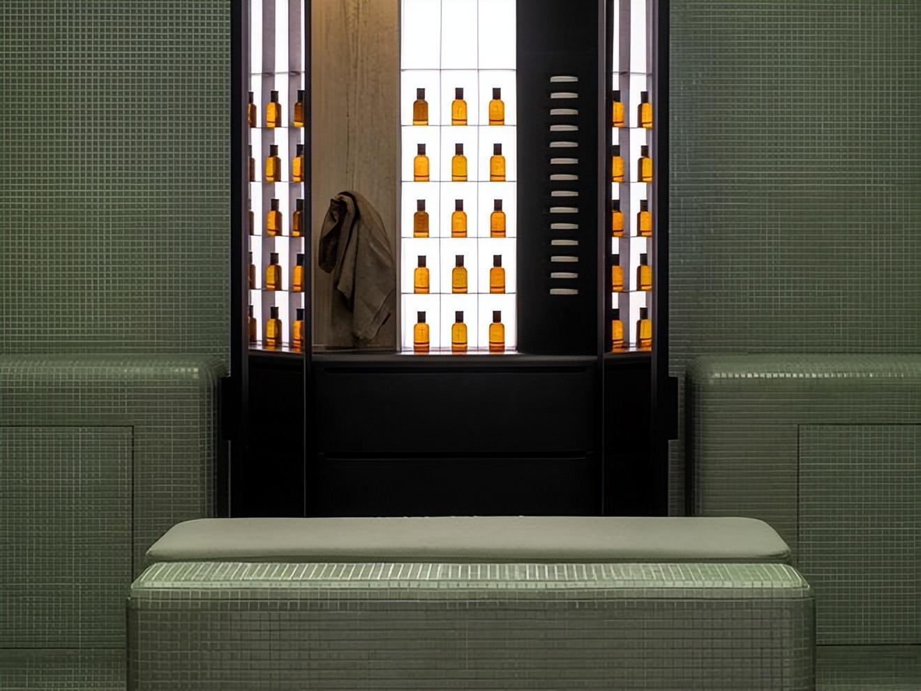 對于居家空間的想象將伊索“香氛空間”詮釋成了一間浴室 ,鋪滿單色瓷磚的房間之中藏有兩座“香氛衣柜” ,其中隱藏了 Aesop 伊索香水系列的迷人世界──只有在打開時才能一探究竟。
