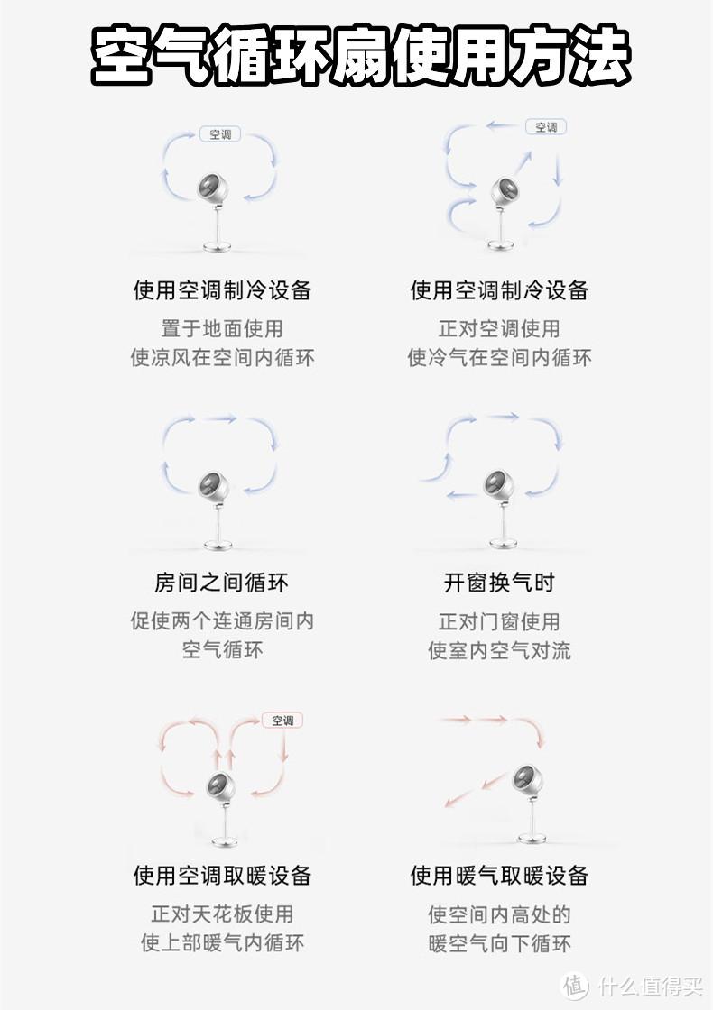 4、空氣循環(huán)扇的正確打開方式空氣循環(huán)扇不止可以在夏天配合空調(diào)用,還可以在冬天配合暖氣、春秋配合開窗換氣,一年四季都能用得上。