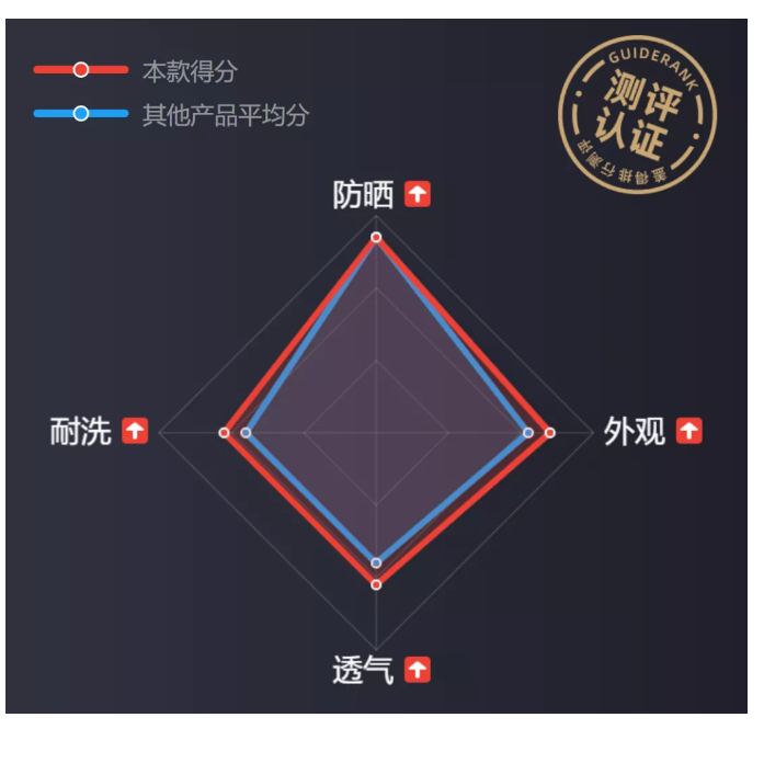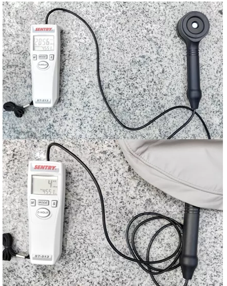 在廣州7月份的中午2點(diǎn),戶外紫外線強(qiáng)度約為2856μW/cm2。遮陽(yáng)帽帽檐下方強(qiáng)度為4μW/cm2,帽頂下方強(qiáng)度為5μW/cm2,阻隔率為99.7%以上,在同類測(cè)試中表現(xiàn)突出。