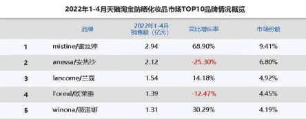 魔鏡市場情報顯示,2022年1月至4月,在淘寶天貓平臺,mistine蜜絲婷以2.94億元銷售額高居防曬化妝品榜首,同比增長68.90%,與第二名anessa安熱沙有0.84億元差距,市場份額也由去年的5.00%增加到9.41%,成為當(dāng)前少有的高增長和高規(guī)模防曬品牌。而在此前三年,安熱沙一直穩(wěn)居防曬類化妝品榜首,蜜絲婷三年排名分別第6、第2和第4。