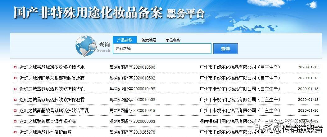 雖然不止一份宣傳材料聲稱其面膜具有美白的功能,然而事實(shí)卻是持否定態(tài)度的。經(jīng)查國產(chǎn)非特殊用途化妝品備案平臺,我們發(fā)現(xiàn)迷幻之城煥顏補(bǔ)水修護(hù)面膜的備案編號為“粵G妝網(wǎng)備字2019265278 ”,實(shí)際生產(chǎn)企業(yè)為廣州市卡妮爾化妝品有限公司,可見此產(chǎn)品屬于非特殊用途化妝品,宣傳特殊化妝品才具有的美白功,則涉嫌虛假宣傳。