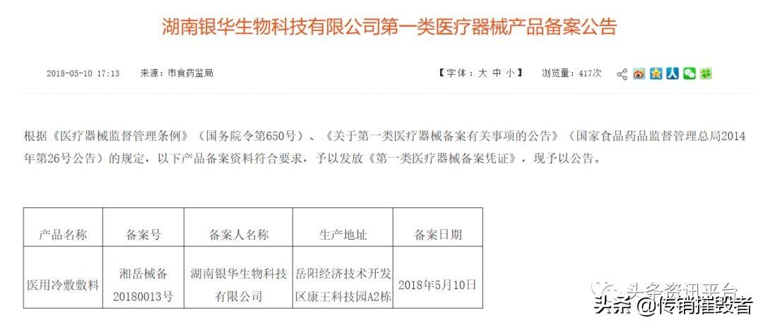 另外,根據(jù)此產(chǎn)品的備案編號湘岳械備20180013號,我們找到了幾款由湖南銀華生物科技有限公司生產(chǎn)的同類產(chǎn)品,業(yè)內(nèi)人士曾對此表示,“醫(yī)用冷敷敷料(湘岳械備20180013號)”是經(jīng)藥監(jiān)局備案的一類醫(yī)療器械,不是藥品,不含藥物成分,不能代替藥物功,冷敷一般是通過物理降溫來緩解局部癥狀的。