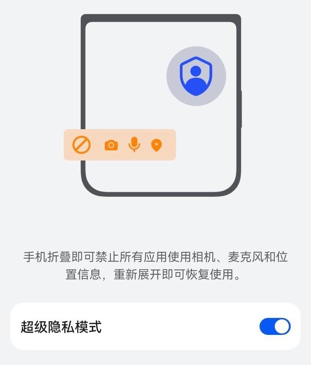 對于那些十分注重隱私的用戶,華為P50 Pocket上還提供了十分強大的隱私模式。開啟隱私模式后,當(dāng)合上手機時,手機會自動關(guān)閉攝像頭、麥克風(fēng)和定位功能,展開后即可恢復(fù)使用,不用擔(dān)心手機成為你身邊的泄密源。