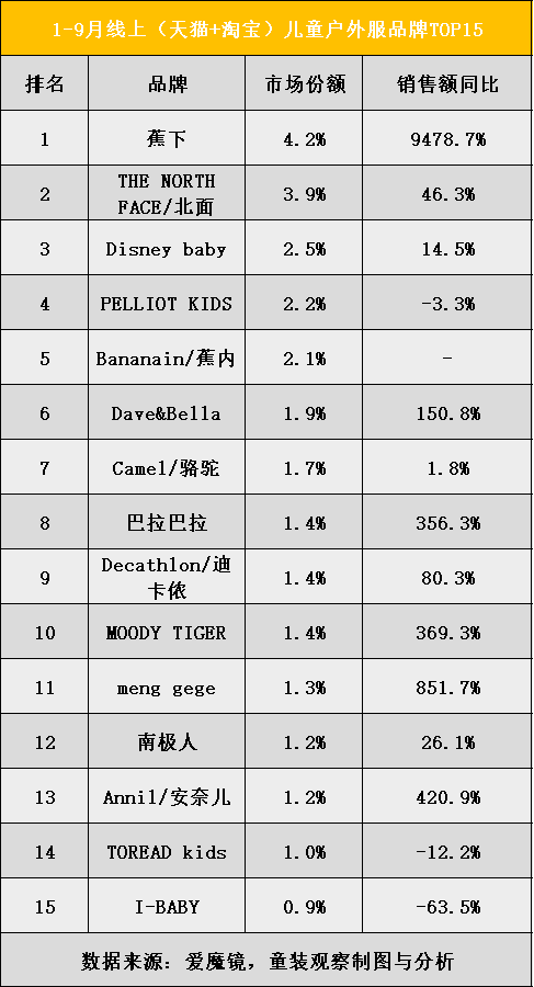 愛魔鏡數(shù)據(jù)顯示,截止2022年9月,在天貓、淘寶電商平臺上,兒童戶外服TOP15品牌總份額為28.3%,超過3%的只有蕉下和北面,分別占據(jù)4.2%、3.9%,可見兒童戶外服賽道并不集中,品牌想要突出的機(jī)會還是比較大的。