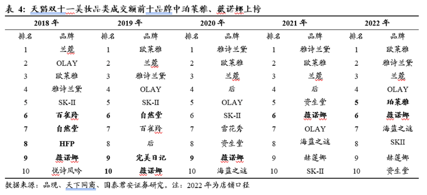 在高端美妝市場,國際品牌的地位或許在很長的一段時間內(nèi)都很難被撼動。拿今年天貓雙十一美妝品類成交額前十品牌看,國貨品牌僅有珀萊雅、薇諾娜擠進(jìn)榜單第五、第六,Euromonitor數(shù)據(jù)顯示,自2019年以來,高端化妝品市場份額前三位置就被歐萊雅、雅詩蘭黛、LVMH牢牢把持,2021年上述品牌市占率分別達(dá)18.4%、14.4%、8.8%。