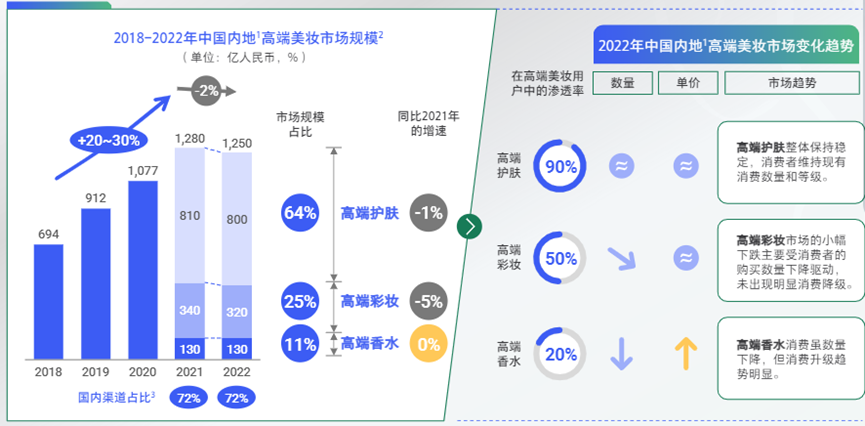 高端香水須超500元;在高端護(hù)膚板塊,(有顯著修復(fù)功類)精華/面霜/眼霜類產(chǎn)品定價超過500-750元,(日常打理類)化妝水/卸妝/洗面奶/面膜/防曬/身體乳定價超過200-300元;在高端彩妝板塊,(整臉妝容)粉底/妝前乳/打底/散粉超350元,(局部妝容)遮瑕/高光or腮紅/眼影眼線睫毛膏/眉筆超200-250元,(唇部妝容)口紅/唇膏超過250元。對上述品類進(jìn)行統(tǒng)計后發(fā)現(xiàn),2022年中國高端美妝市場小幅微跌2%,主要系量減,但產(chǎn)品購買檔次及價格并無波動。其中,高端護(hù)膚、高端彩妝、高端香水的用戶滲透率分別達(dá)到90%、50%、20%,高端彩妝消費(fèi)客群數(shù)微跌,高端香水呈現(xiàn)量減、價增的趨勢。