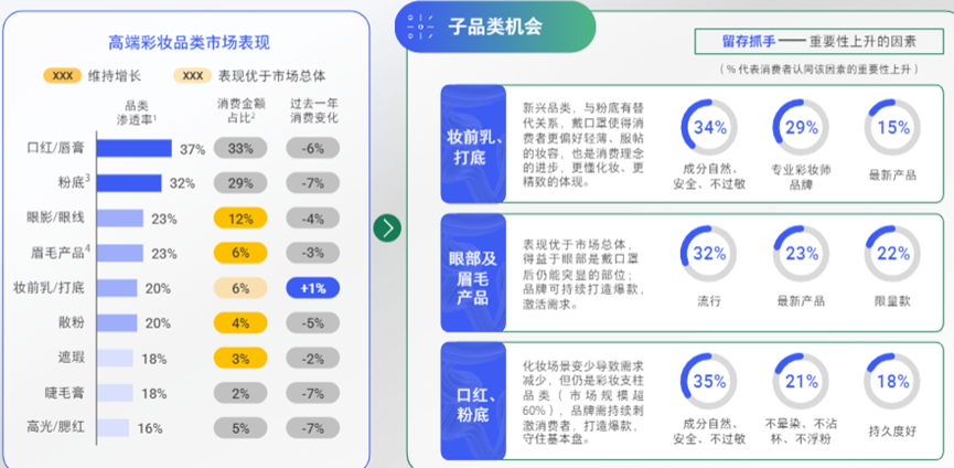 第一類是由新妝容方式(口罩妝/眼部妝容)帶動的新品類,眼影/眼線、眉毛產(chǎn)品,該品類消費(fèi)者認(rèn)同產(chǎn)品是否符合流行趨勢(32%)、上新(23%)及限量(22%);第二類是隨著化妝知識進(jìn)階帶動的品類,妝前乳/打底、散粉、遮瑕;消費(fèi)者除了關(guān)心該品類的成分(34%),還會特別留意是否專業(yè)(29%)和上新(15%);除此之外,口紅、粉底仍然是彩妝的支柱品類(超60%),消費(fèi)者關(guān)心的是成分(35%),不暈染/不沾杯/不浮粉(21%),持久度好(18%)。