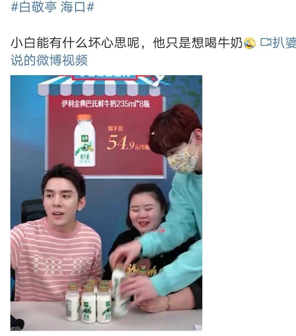 ????小白定好的是晚上10點鐘直播,到了約定的10點,上一個商品還沒有播完,白敬亭戴著可愛的口罩就開始扮演工作人員,上來搬牛奶趕人了:
