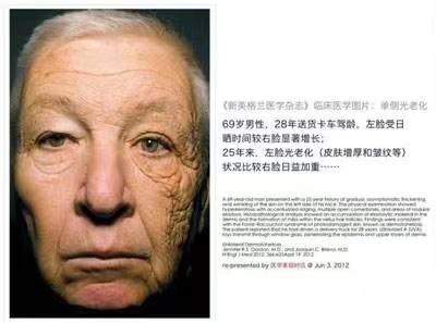 “光老化”現(xiàn)象是由一個(gè)知名美國(guó)雜志提出的,說(shuō)的就是由于一個(gè)司機(jī)長(zhǎng)期只有一半臉接受太陽(yáng)的直射,在這種嚴(yán)格控制變量的對(duì)比試驗(yàn)之下,他只有長(zhǎng)期照射陽(yáng)光的一半臉出現(xiàn)了嚴(yán)重的老化,體現(xiàn)為皮膚的松弛與褶皺,十分駭人。