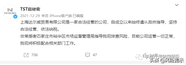 TST庭秘密在微博連夜發(fā)文否認(rèn)稱,上海達(dá)爾威貿(mào)易有限公司是一家合法經(jīng)營(yíng)的公司,自成立以來(lái)始終遵從政府指導(dǎo),堅(jiān)持依法經(jīng)營(yíng),依法納稅。并表示感謝石家莊裕華區(qū)市場(chǎng)監(jiān)督管理局指導(dǎo)排查風(fēng)險(xiǎn),會(huì)積極配合相關(guān)工作。