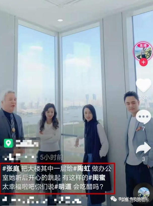 2020年10月,多名網(wǎng)友爆料,張庭帶著陶虹和演員明道參觀自己斥資17億購(gòu)入的、位于黃浦江邊的新大樓。有消息稱,張庭給陶虹一層樓做辦公室。