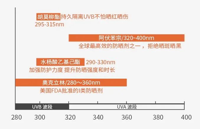 奧克立林:美國FDA認(rèn)證批準(zhǔn)的I類防曬劑(FDA是美國的食品藥品管理局,i類驗(yàn)證該成分不含生物性危害),能防御波長在280~360nm的UVA和UVB;
