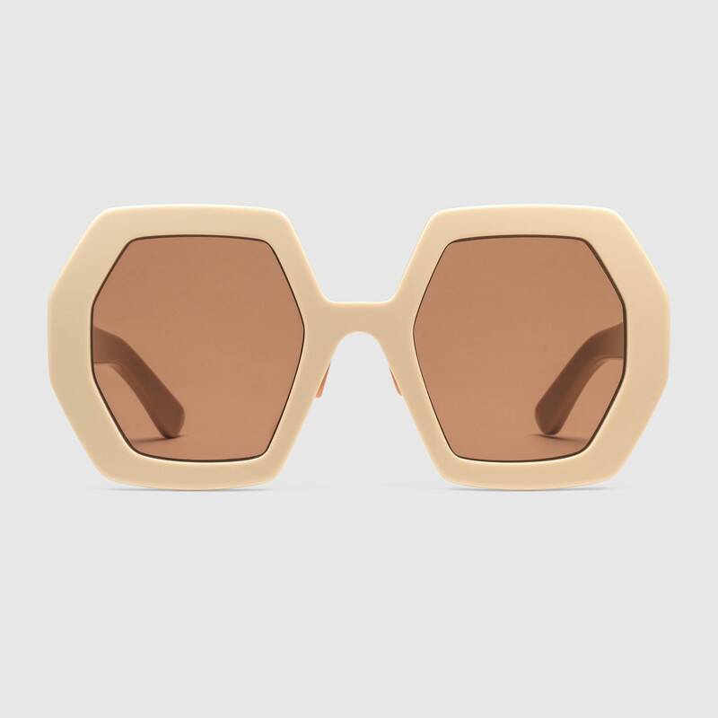 這款太陽眼鏡采用超大造型的象牙白色醋纖鏡框,別致夸張的八邊形設(shè)計(jì)充分詮釋了本季倍加推崇的復(fù)古風(fēng)格設(shè)計(jì)。 鏡腿上匠心裝飾金色調(diào)金屬互扣式雙G細(xì)節(jié),彰顯不凡的品牌內(nèi)涵。