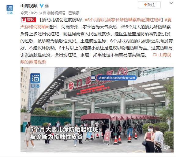 近日,河南鄭州一家長(zhǎng)因?yàn)樘鞖庋谉幔o5個(gè)月大的嬰兒涂防曬霜后身上多處出現(xiàn)紅斑,前往河南省人民醫(yī)院就診。經(jīng)醫(yī)生檢查是防曬霜刺激引發(fā)的過(guò)敏,被診斷為接觸性皮炎。王建波醫(yī)生稱,6個(gè)月以內(nèi)的嬰兒皮膚還沒(méi)有發(fā)育好,不建議涂防曬,6個(gè)月以上的健康小孩還是建議以物理防曬為主。過(guò)度防曬易引發(fā)接觸性皮炎,會(huì)出現(xiàn)紅斑、水皰,如果處理不當(dāng)容易感染留疤。