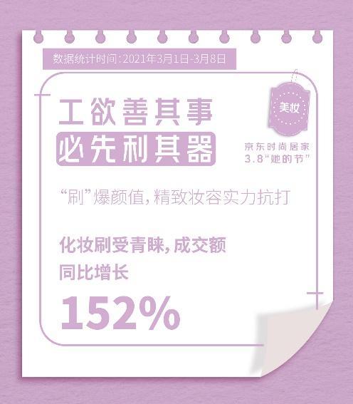 冬去春來,從“貓冬”到“賞春”,女性對(duì)于精致妝容的要求日漸提升,“全套搞定美顏”成一大趨勢(shì)。本次3.8“她的節(jié)”,京東彩妝套裝成為大熱趨勢(shì),銷量同比去年增長13倍,“中國風(fēng)”走俏,日記小細(xì)跟口紅細(xì)管口紅禮盒、花西子x杜鵑定制東方佳人妝奩彩妝套裝成消費(fèi)者愛國風(fēng)彩妝禮盒。另外,化妝刷備受青睞,銷量同比增長152%,可謂工欲善其事必先利其器,一套順手好刷,助力女性隨時(shí)“刷”出精致妝容。