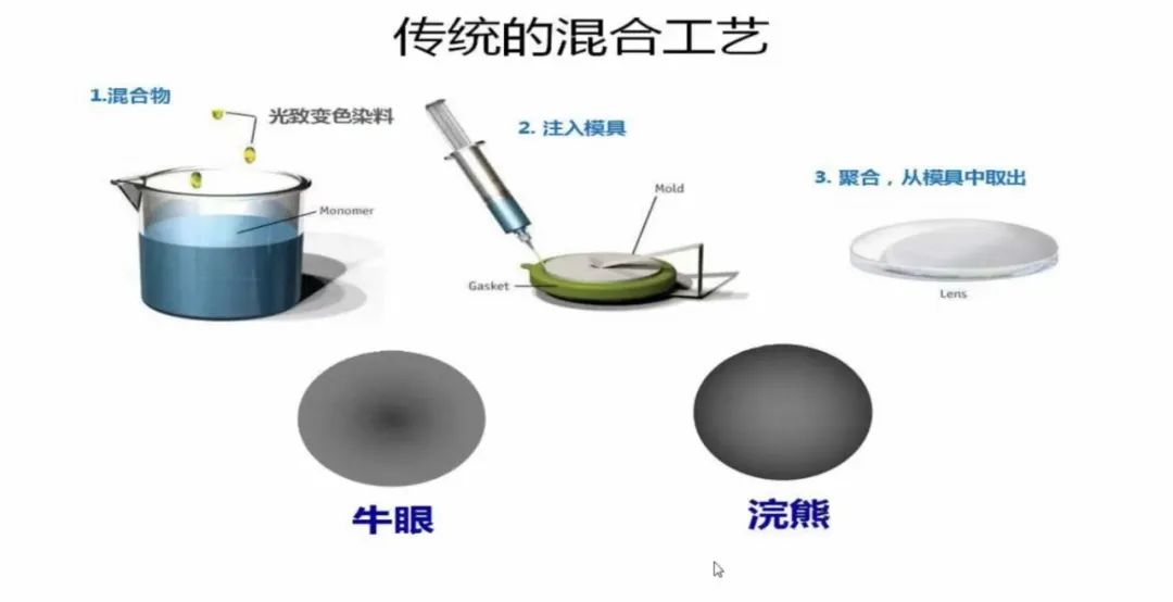 傳統(tǒng)的變色鏡片工藝 —— 基變工藝,是將變色染料注入片基中,通過基片混合變色物質(zhì)制成的光致變色片,因邊緣厚度與中心厚度相差較大,變色后鏡片顏色深淺不一,會(huì)出現(xiàn)“牛眼”、“浣熊”等現(xiàn)象影響外觀。