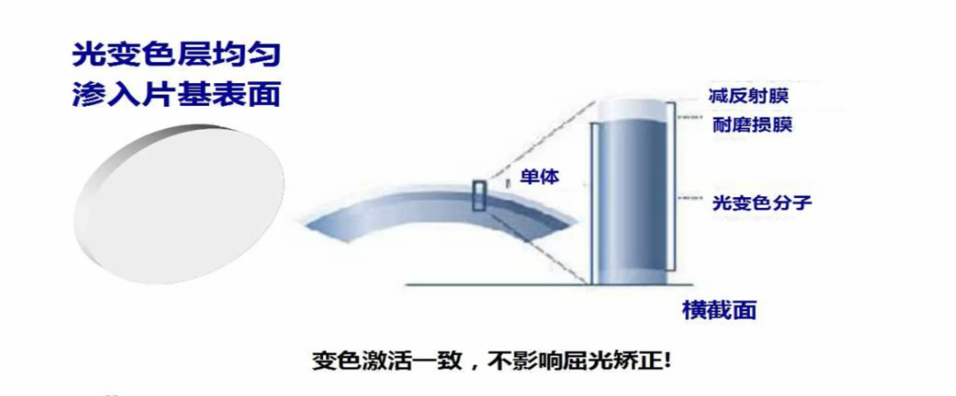 新一代的變色鏡片工藝 —— 膜層變色工藝(膜變),是通過將變色物質(zhì)滲透基片表面制成的光致色片,顏色均勻,褪色變色速度快,且為可分裂重組的納米復(fù)合材料基材。尤其適合矯正視力度數(shù)較高的顧客,并可附加在各種功能型鏡片上。