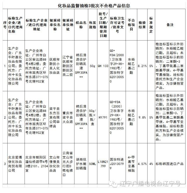 標(biāo)稱廣東千葉惠化妝品有限公司(委托方:廣州十長生化妝品有限公司)生產(chǎn)的2批次韓后清透倍護(hù)防曬乳液SPF30PA++檢出水楊酸乙基己酯超標(biāo)。這2批不合格化妝品種,其中1批次在遼寧省檢出,被采樣單位為撫順市新?lián)嵝∶廊嘶瘖y品店。而經(jīng)過對標(biāo)稱生產(chǎn)企業(yè)和委托企業(yè)的現(xiàn)場核查,2批次標(biāo)稱韓后清透倍護(hù)防曬乳液SPF30PA++的產(chǎn)品為涉嫌假冒產(chǎn)品。
