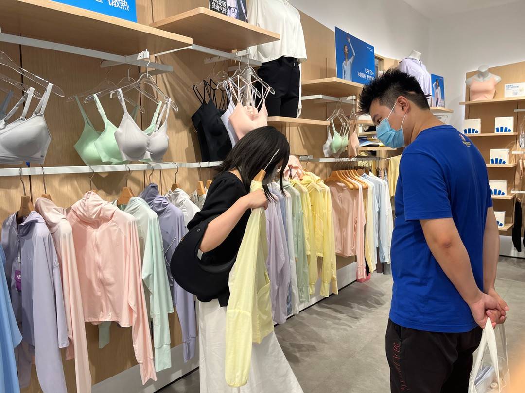 記者在店內(nèi)了解到,近期成都持續(xù)高溫,來選購(gòu)防曬用品的消費(fèi)者絡(luò)繹不絕,人多的時(shí)候,店員甚至有些忙不過來。近一個(gè)多月,防曬用品整體銷量暴增,傘、帽子、袖套都是爆款,很多人在小紅書種草了貝殼防曬帽,專門來找同款。防曬衣增長(zhǎng)快,尤其是主打款冰觸、冰薄 ,輕薄透氣,寬帽預(yù)防面部曬黑。消費(fèi)者既自用也買來送人。