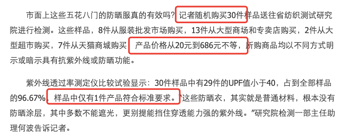 市面上很多防曬衣,幾乎沒有防曬功能,就連600元的品牌防曬衣都翻過車:
