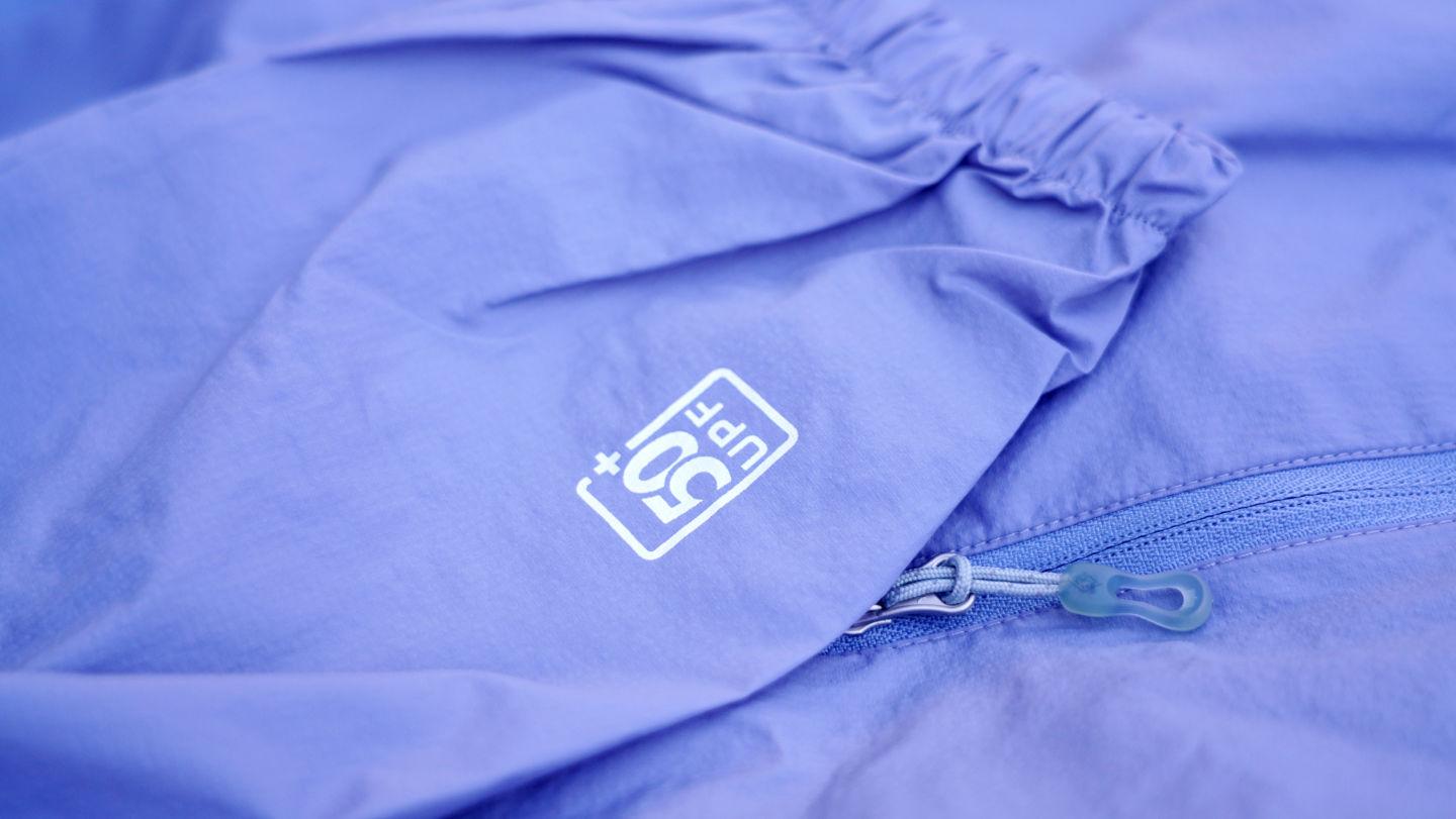 UPF50+的防曬指數(shù)標(biāo)識(shí)設(shè)計(jì)在了袖口,這個(gè)標(biāo)識(shí)根據(jù)紫外線的強(qiáng)烈程度會(huì)呈現(xiàn)出不同的顏色,顏色越紫說明紫外線越強(qiáng),有意思。