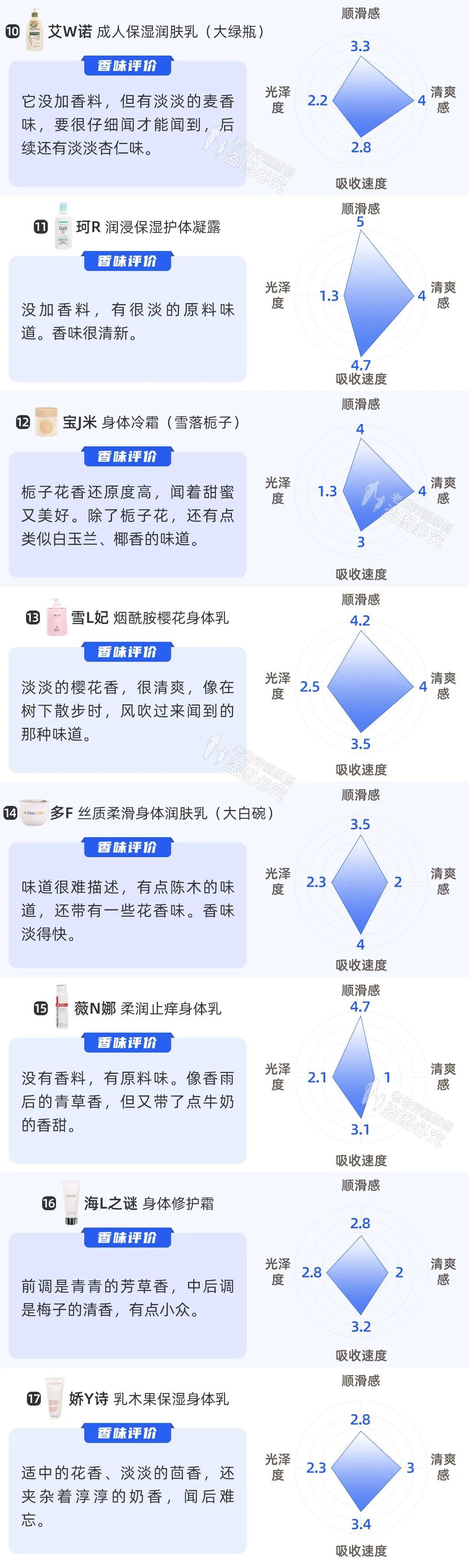 根據(jù)參與者打分,本期樣品中 2 號(hào)妮W雅,7 號(hào)歐S丹、12 號(hào)寶J米從、13 號(hào)雪L妃的香味,大家喜歡程度更高!想看所有身體乳的主觀喜歡程度的,后臺(tái)回復(fù)【身體乳】查看。