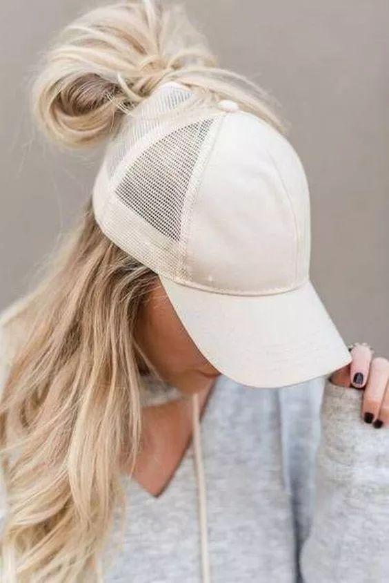 棒球帽還有一大好處就是它具有束發(fā)功能,可以選擇扎個隨性的丸子頭或者半丸子頭,把高扎的丸子從后面調(diào)節(jié)大小的地方穿過去,然后稍稍拉扯制造出蓬松感,低調(diào)又時髦。