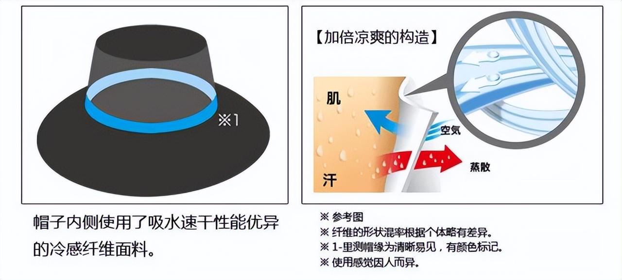 再加上冷感纖維面料的吸濕透氣性(利用自然界中吸熱速度慢,散熱速度快的原理),在頭部出汗的時候可以迅速散熱排汗,不悶熱更清涼。
