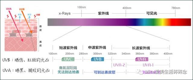根據(jù)波長(zhǎng)大小,又可將其分為:長(zhǎng)波紫外線(xiàn)UVA(波長(zhǎng)320-400nm)、中波紫外線(xiàn)UVB(波長(zhǎng)280-320nm)、短波紫外線(xiàn)UVC(波長(zhǎng)180-280nm)。少量的太陽(yáng)光照射有利于人體對(duì)礦物質(zhì)的吸收,預(yù)防小兒狗僂病和成人軟骨病的發(fā)生,促進(jìn)體內(nèi)新陳代謝,增強(qiáng)免疫功能。但如果長(zhǎng)時(shí)間的將皮膚暴露于太陽(yáng)光下,帶有巨大能量的紫外線(xiàn)將對(duì)皮膚產(chǎn)生不良的作用