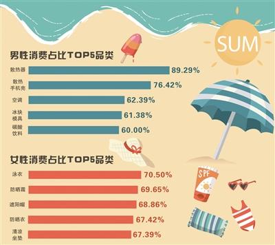 京東大數(shù)據(jù)的全國用戶畫像顯示,男性消費者不忘給自己的電子裝備降溫,而女性消費者則注重自身的防曬,時刻讓自己“白白的”。男性消費占比TOP5品類是散熱器、散熱手機殼、空調(diào)、冰塊模具、碳酸飲料,男性占比分別達到89.29%、76.42%、62.39%、61.38%、60.00%;女性消費占比TOP5品類:泳衣、防曬霜、遮陽帽、防曬衣、清涼坐墊,女性占比分別達70.50%、69.65%、68.86%、67.42%、67.39%。