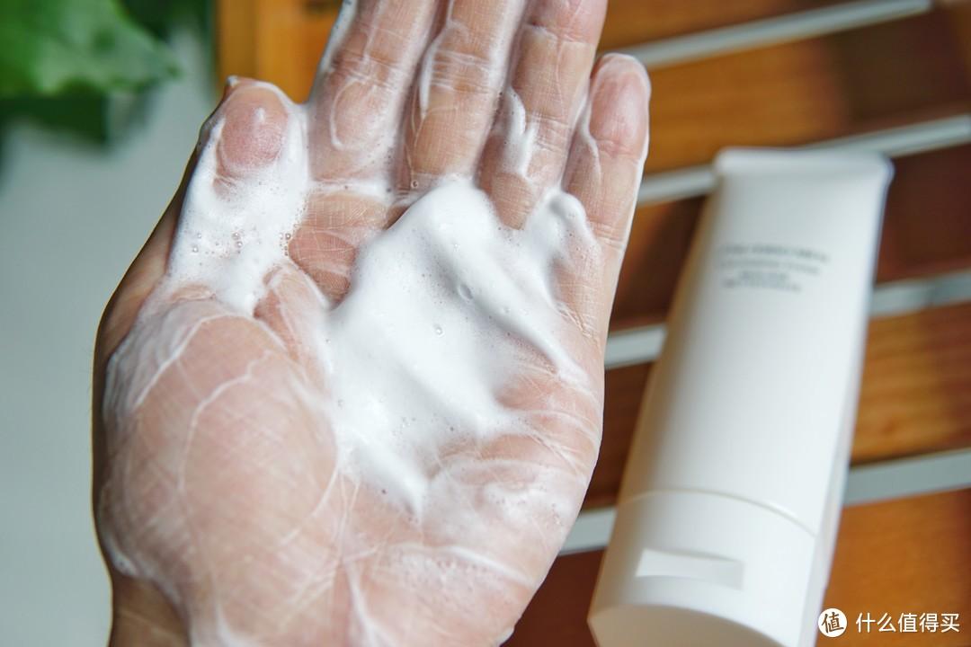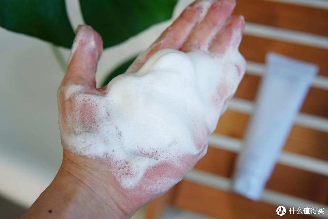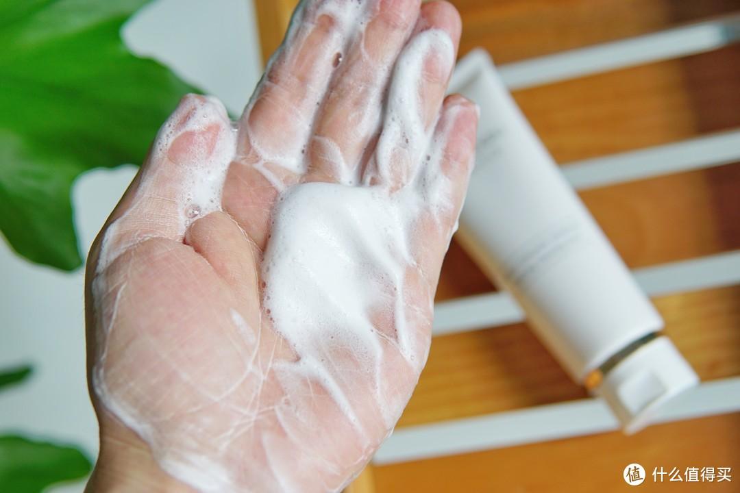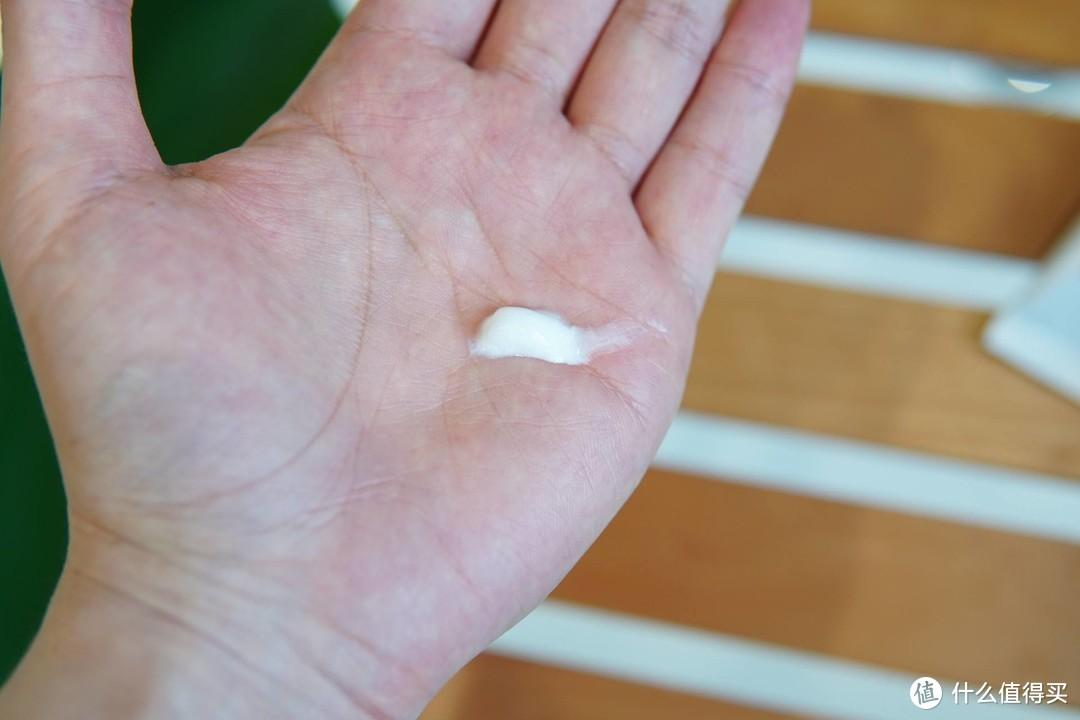 配方上采用了氨基酸表活搭配甜菜堿,性溫和度都較高,同時沒有香精添加,只會有少許原材料的味道。配方里雖然也加了少量的煙酰胺和光果甘草這樣的美白成分,但洗面奶本身停留時間短,果可忽略不計。下圖是按壓2次的量,我個人覺得夠用了,臉大的或者喜歡泡沫更多些的,可以按壓三次使用。